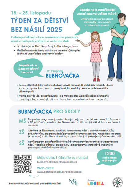 Naše škola se letos aktivně zapojila do celorepublikové akce Bubnovačka, která probíhá v rámci kampaně Týden bez násilí. Cílem tohoto projektu je upozornit na důležitost ochrany dětí před fyzickým i psychickým násilím a dát symbolicky najevo, že hlas dětí nesmí být přehlížen.