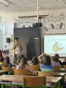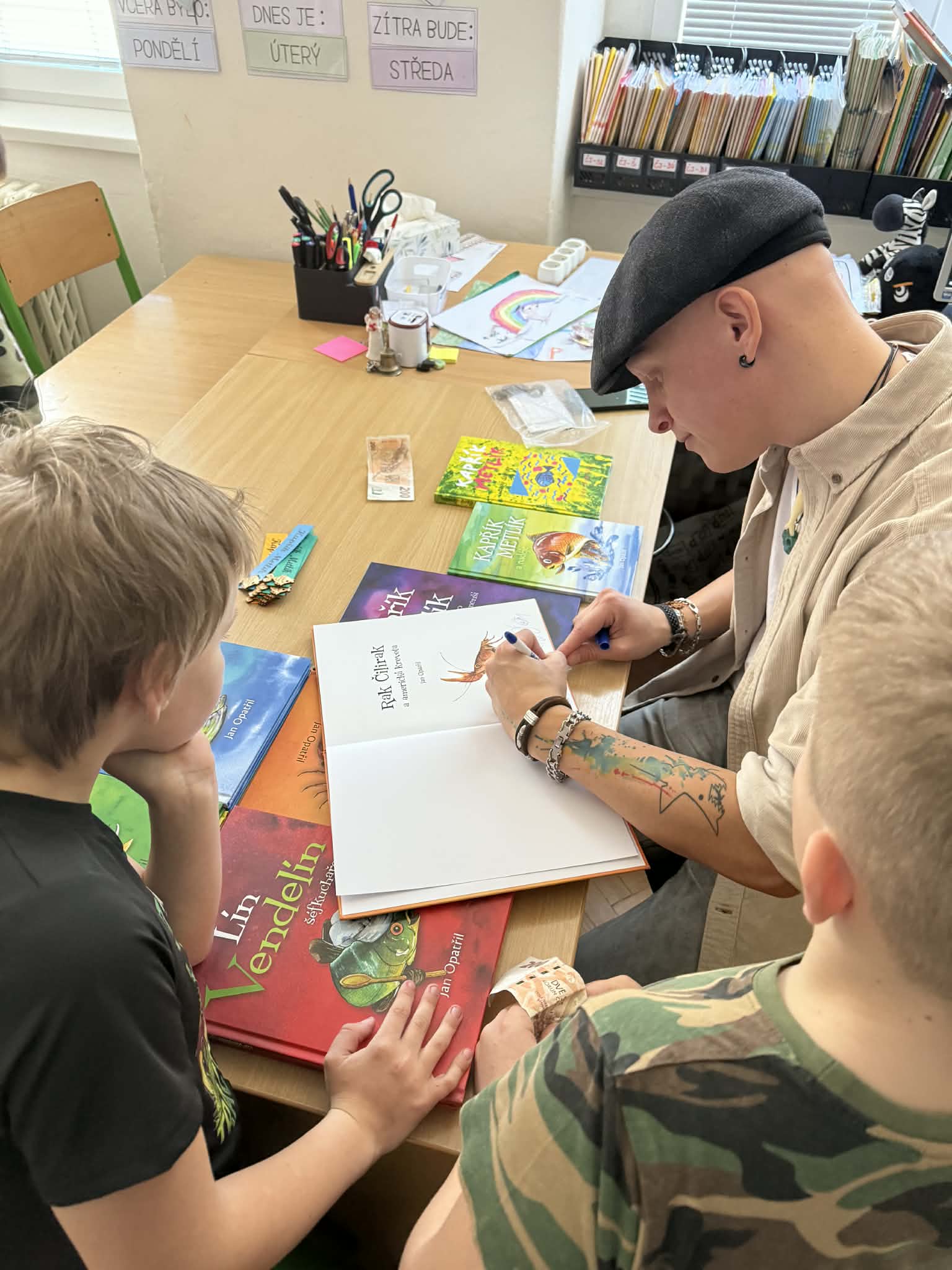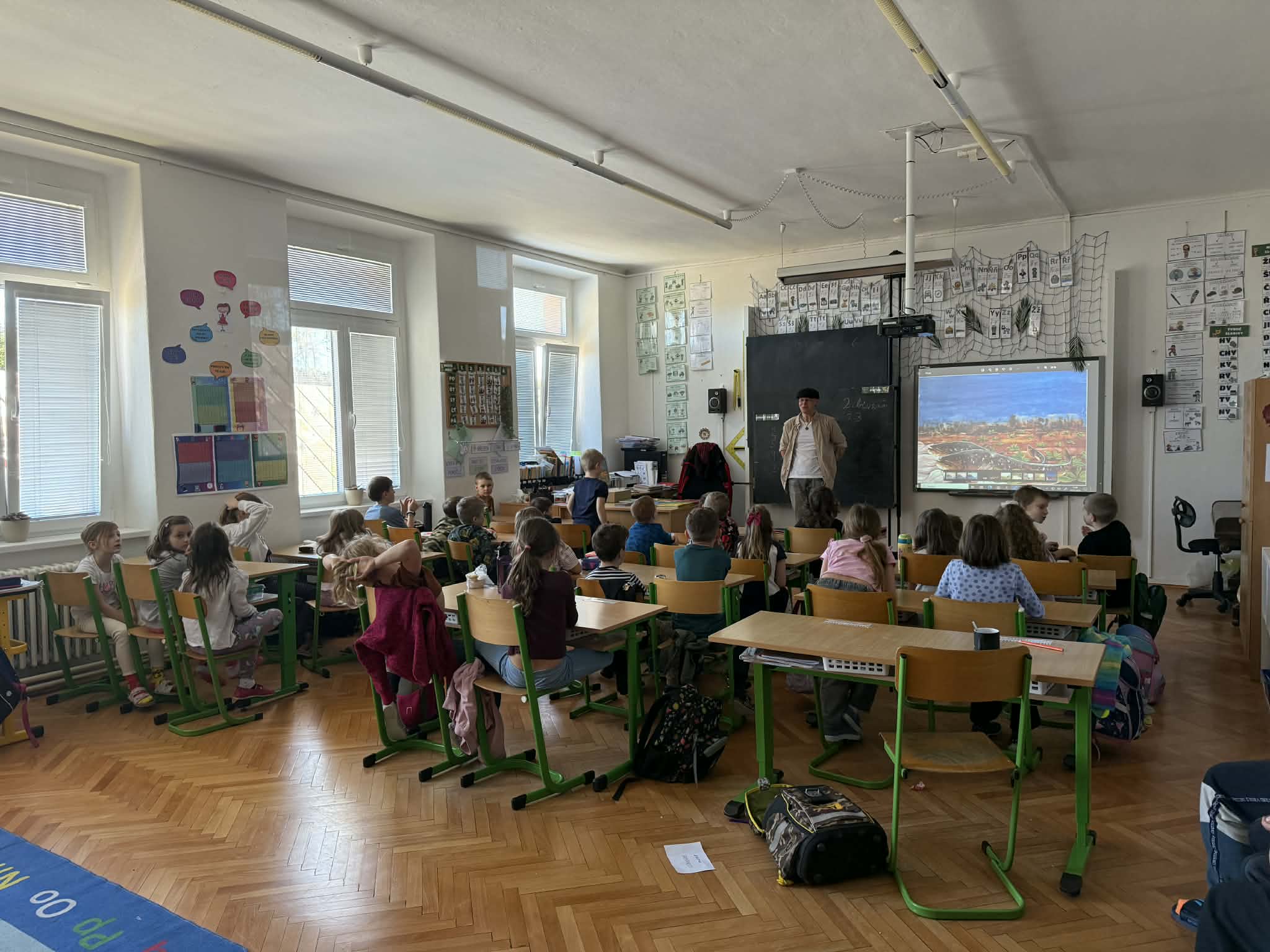 Pan spisovatel nám poutavě vyprávěl o tom, jak vznikají jeho knihy, kde bere inspiraci pro své postavy a jak vypadá práce spisovatele v každodenním životě. Dozvěděli jsme se, že psaní není jen o fantazii, ale také o vytrvalosti, trpělivosti a radosti z tvoření. Žáci se aktivně zapojovali, kladli zvídavé otázky a bylo vidět, že je povídání opravdu baví.